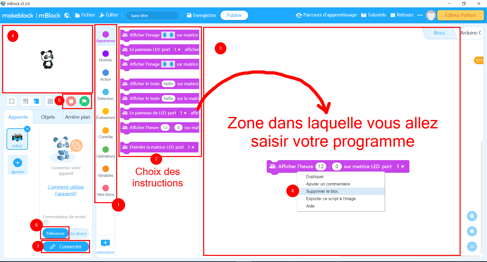 | (4) Zone de test pour programmer une image à la place du mBot | (8) Pour supprimer une instruction, clic droit -> supprimer le bloc |